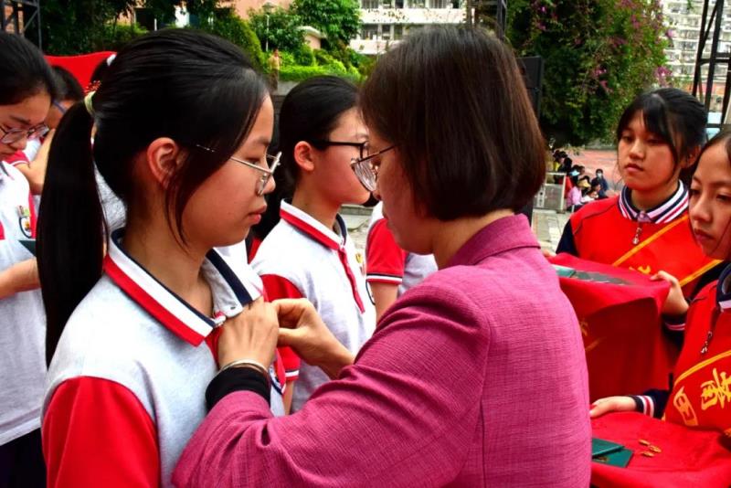 “我們是共產(chǎn)主義接班人……”在嘹亮的隊(duì)歌聲中,少先隊(duì)員們帶著不舍、帶著憧憬,摘下了紅領(lǐng)巾并認(rèn)真折疊、珍藏。珍藏紅領(lǐng)巾讓同學(xué)們感到退隊(duì)和入隊(duì)一樣神圣而莊嚴(yán),團(tuán)組織的召喚就在眼前。與會(huì)領(lǐng)導(dǎo)為新團(tuán)員佩戴上了象征榮耀的團(tuán)徽并莊嚴(yán)宣誓:為共產(chǎn)主義事業(yè)而奮斗!新團(tuán)員們佩戴團(tuán)徽,舉起右拳,莊嚴(yán)宣誓時(shí),整個(gè)儀式推向了高潮,莊嚴(yán)的誓詞不僅充滿了整個(gè)會(huì)場(chǎng),也激蕩著每一位青年的心。