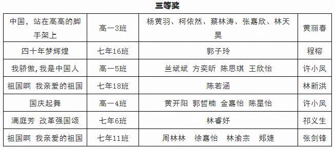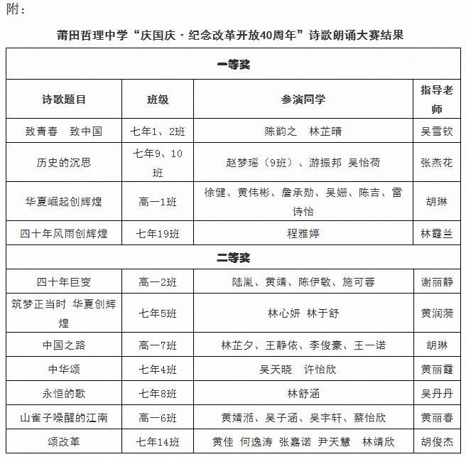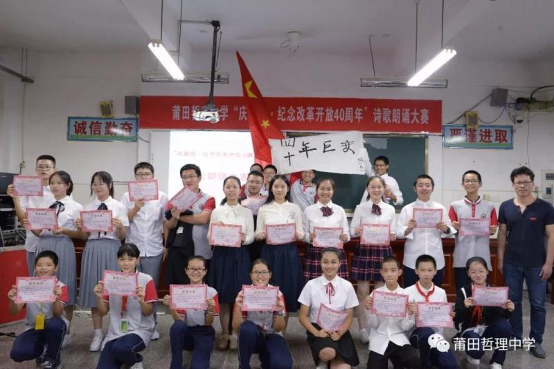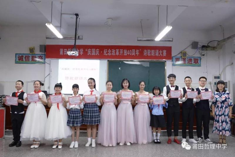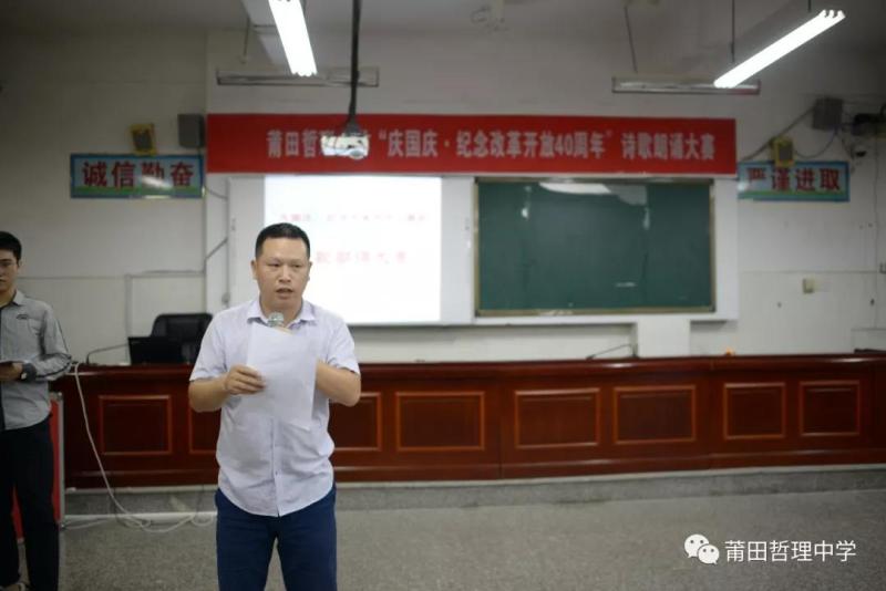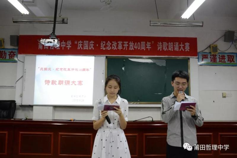 為慶祝偉大祖國母親69歲生日,歌頌改革開放偉大成就,弘揚(yáng)優(yōu)秀文化,豐富課余生活,并進(jìn)一步落實(shí)我校課外閱讀系列活動方案,從而營造詩意盎然、書香縈繞的校園文化氛圍,9月28日晚,我校在新教學(xué)樓一樓會議室隆重舉行 “慶國慶·紀(jì)念改革開放40周年”詩歌朗誦大賽。 本次詩歌朗誦大賽的參賽選手來自七年級和高一年級,主持人由學(xué)校播音與主持協(xié)會的王嘉濠、張嘉欣同學(xué)擔(dān)任,評委老師由林志峰、范秀植、周藝娟、楊皇、林婷、陳素貞、吳春娥等老師擔(dān)任。 朗誦大賽在高一(3)班楊黃羽、柯依然、蔡林濤等朗誦的現(xiàn)代詩《中國,站在高高的腳手架上》中拉開序幕?;顒蝇F(xiàn)場,朗誦者們以獨(dú)誦、雙人朗誦、群頌等形式,先后聲情并茂地朗誦了《筑夢正當(dāng)時(shí) 華夏創(chuàng)輝煌》、《中國之路》、《致青春 致中國》、《四十年巨變》、《我驕傲,我是中國人》、《祖國?。∥矣H愛的祖國》、《國慶起舞》、《滿庭芳 改革強(qiáng)國頌》等優(yōu)秀詩歌作品,或道出了對祖國母親69華誕的祝福;或回憶了中國五千年的滄桑與堅(jiān)強(qiáng);或表達(dá)了對中國歷經(jīng)風(fēng)雨風(fēng)采依舊的贊美;或謳歌了改革開放四十年來所取得的偉大成就……詩以傳情,情以動人,全體參賽選手深情投入,用心演繹,用最樸實(shí)的語言、最動聽的聲音,傾訴著自己的拳拳之心。為時(shí)兩個(gè)小時(shí)的詩歌朗誦大賽高潮迭起,掌聲不斷,最后在七年(14)班黃佳、何逸濤、張嘉諾等同學(xué)的詩歌《頌改革》朗誦中落下帷幕。 大賽結(jié)束后,語文組組長范秀植老師代表評委組當(dāng)場宣布比賽結(jié)果:七年(1)、(2)班、七年(9)、(10)班、七年(19)班和高一(1)班等班級的四個(gè)節(jié)目獲得一等獎(jiǎng),七年(5)班、高一(2)班等班級的七個(gè)節(jié)目獲得二等獎(jiǎng),七年(16)班、高一(2)班等班級的七個(gè)節(jié)目獲得三等獎(jiǎng)。