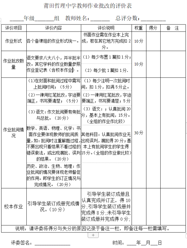 附件:莆田哲理中學(xué)教師作業(yè)批改評(píng)價(jià)表