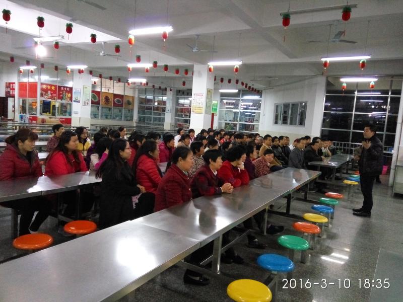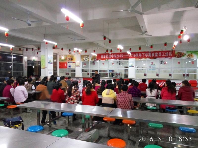 為提高我校食堂從業(yè)人員的安全意識(shí)和實(shí)際操作能力,2016年3月10日晚上,我校分管后勤的李迎清副校長(zhǎng)和總務(wù)處陳文武主任等對(duì)三個(gè)食堂的員工開(kāi)展了食品安全、消防安全、和食堂操作要求的知識(shí)培訓(xùn)。培訓(xùn)結(jié)合近年來(lái)發(fā)生的相關(guān)案例,生動(dòng)地闡述了普及安全知識(shí)、提升安全意識(shí)的重要性,同時(shí)結(jié)合我校食堂的實(shí)際情況進(jìn)行了詳細(xì)的工作部署。
