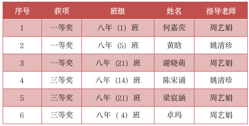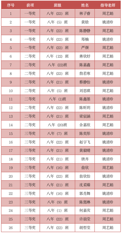 在2022年莆田市八年語文學(xué)科能力測試中,我校林子睿等二十六位同學(xué)獲獎,具體獲獎情況如下: