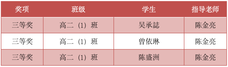 在2022年全國高中數(shù)學(xué)聯(lián)賽福建省莆田賽區(qū)比賽中,我校吳承誌、曾依琳、陳盛洲三位同學(xué)獲獎,具體獲獎情況如下: