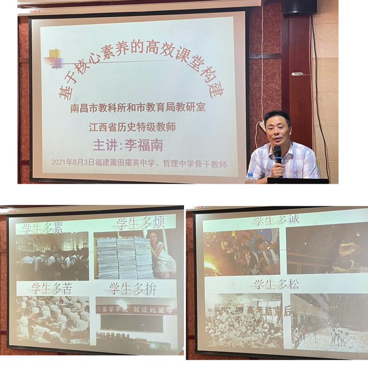 上午,江西省歷史特級教師,中學(xué)歷史高級教師,省首批中小學(xué)骨干教師,市學(xué)科帶頭人李福南老師,通過兩張能夠反映現(xiàn)代高中生學(xué)習(xí)狀態(tài)的圖片講解,生動導(dǎo)入并開始《基于核心素養(yǎng)的高效課堂構(gòu)建》精彩講座。