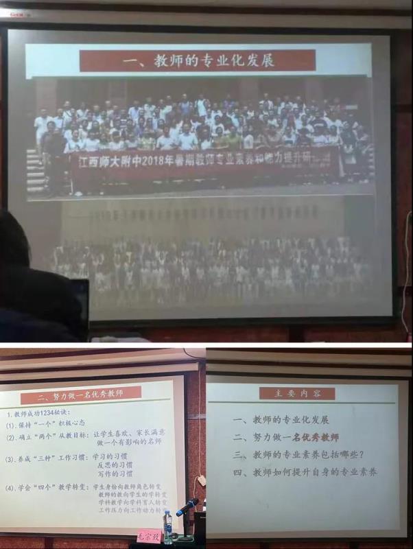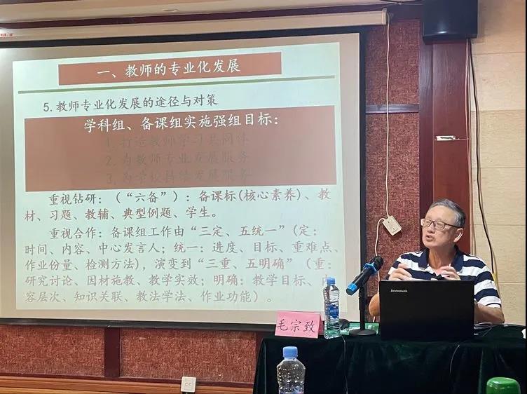 總的來說,高效課堂是一個蝴蝶破繭、鳳凰涅盤的過程,是一場持久戰(zhàn)。最后送給大家兩句話,與各位同仁共勉:真教真學(xué),方顯教師本色;真練真專,打造高效課堂。在這場戰(zhàn)爭中,我們要有戰(zhàn)略家的眼光、軍事家的策略和指揮家的才能,更要有科學(xué)家的實干。 下午,我們有幸聆聽了江西師范大學(xué)附屬中學(xué)特級教師、中小學(xué)正高級教師毛宗致老師的《教師專業(yè)化成長的現(xiàn)實困境與跨越路》專題講座。