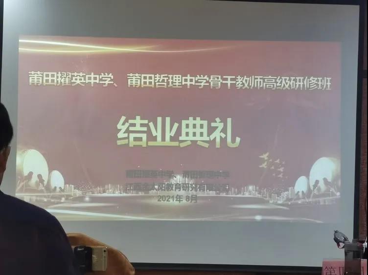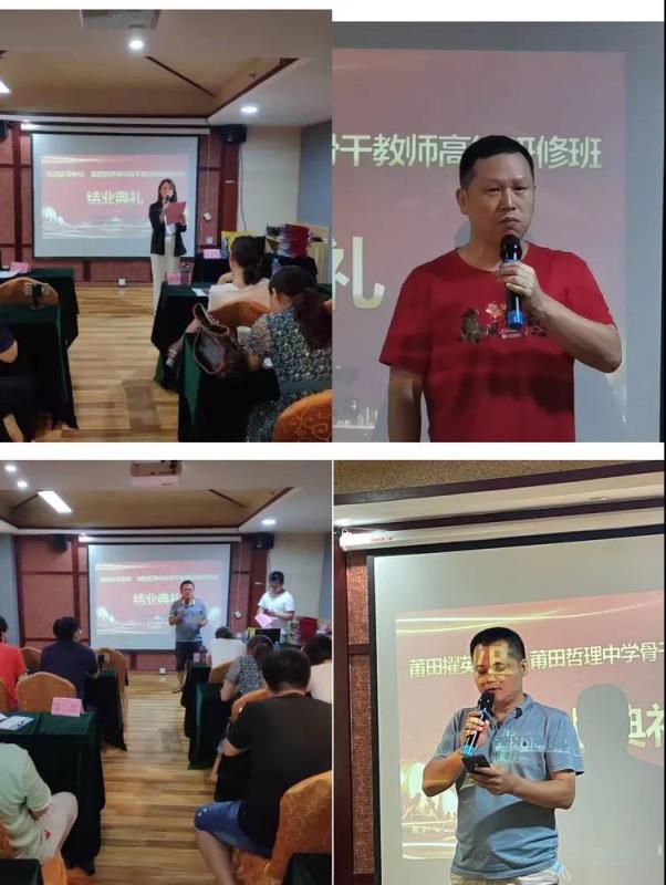 不知不覺,為期一周的培訓(xùn)已接近尾聲。在講座之后,我們進行了隆重的結(jié)訓(xùn)典禮儀式。在承辦單位代表周小云進行總結(jié)發(fā)言后,哲理中學(xué)參訓(xùn)代表范秀植老師和擢英中學(xué)參訓(xùn)代表姚凌元老師分別上臺進行精彩的培訓(xùn)心得分享。最后,活動在莆田哲理中學(xué)教研室主任董立群熱情洋溢的總結(jié)中落下帷幕。