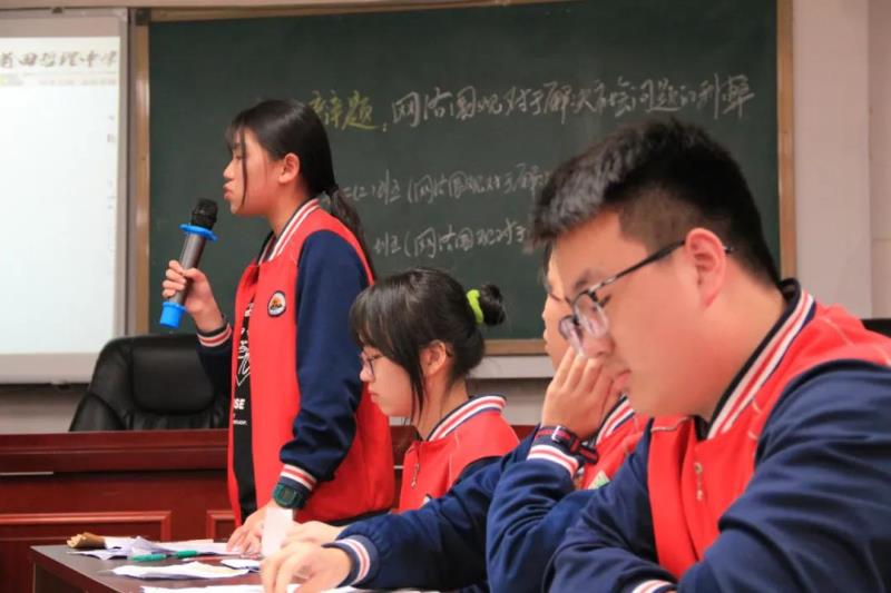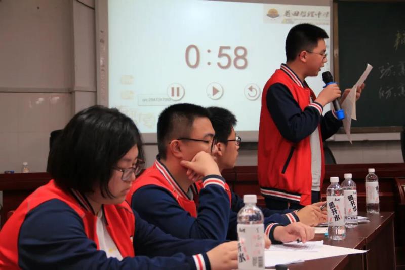 辯論賽(復(fù)賽)的對手及正反方由抽簽決定。第一場的正方是高一代表隊,反方是高二(4)班代表隊,他們圍繞“成大事者要不要拘小節(jié)?”展開激烈辯論,雙方環(huán)環(huán)相扣,言辭犀利,賽場氣氛緊張又熱烈。