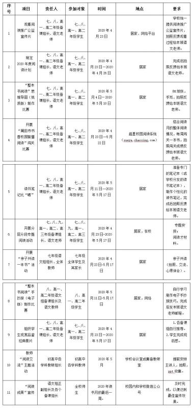 凡事預則立,不預則廢。一個好的閱讀計劃可以使閱讀效果事半功倍。一年之計在于春,在春暖花開之時,為了讓學生養(yǎng)成良好的閱讀習慣,提高學生的閱讀理解能力,我校決定組織非畢業(yè)班學生自行擬定2020年度課外閱讀計劃,含“閱讀目標”、“閱讀時間”及“閱讀清單”等內容。具體如下: 責任人:七、八、高一、高二年級備課組長、語文老師 活動對象:七、八、高一、高二年級學生 活動時間:2020年4月23日—2020年4月26日 活動地點:居家 活動要求:完成后拍照反饋給本班語文老師 3.“整本書閱讀”思維導圖(紙質版)制作比賽