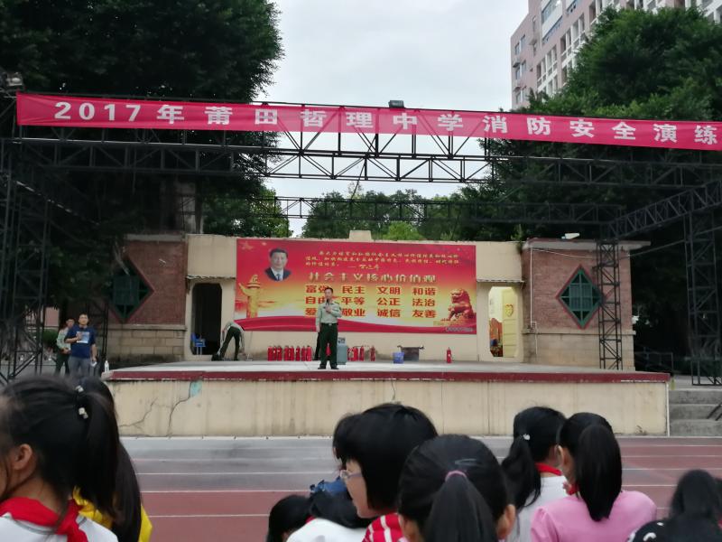 為切實提高我校師生的消防意識,真正掌握消防安全知識,增強自救互救能力,我校于11月7日開展2017年莆田哲理中學消防安全演練活動。此次活動順利開展,有效提高了全體師生的消防安全意識,豐富了消防安全知識,掌握了應急疏散逃生和滅火器使用的技能,提高全體師生的安全意識和快速反應能力,并取得良好成效。 活動首先由陳培基校長發(fā)言,對全體師生講解此次消防安全演練活動具體內(nèi)容,對活動過程中易出現(xiàn)的情況進行安排,確保活動過程順利開展。本次活動由城廂區(qū)消防大隊官兵指導,活動包括了消防知識教育、消防安全技能演練、消防逃生演練、消防設備參觀學習等多個環(huán)節(jié),通過近距離接觸消防險情和實踐操作的練習,全校師生進一步強化了安全意識,增強了全校師生自救、自護能力,為營造平安、和諧的校園環(huán)境奠定了堅實的基礎。