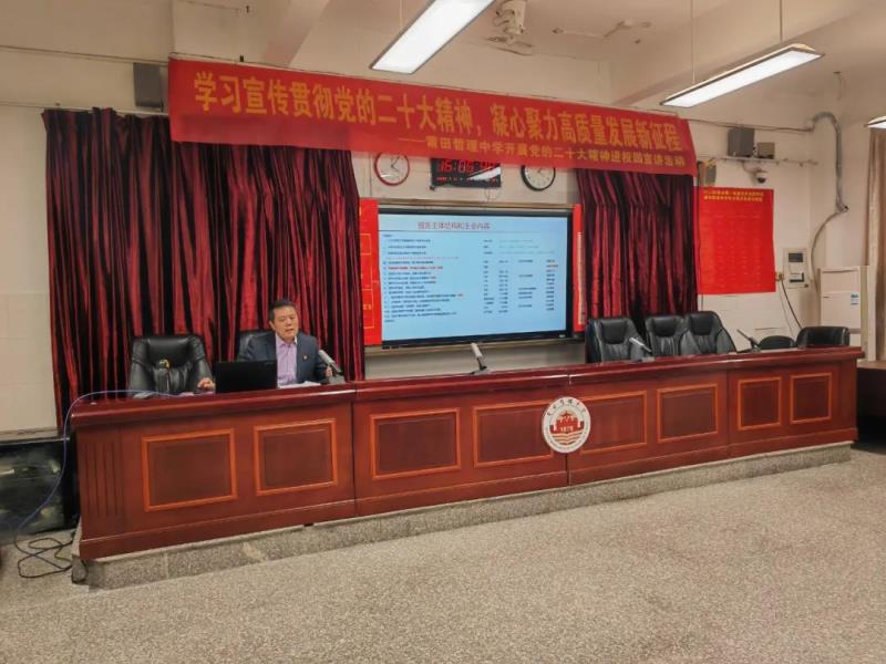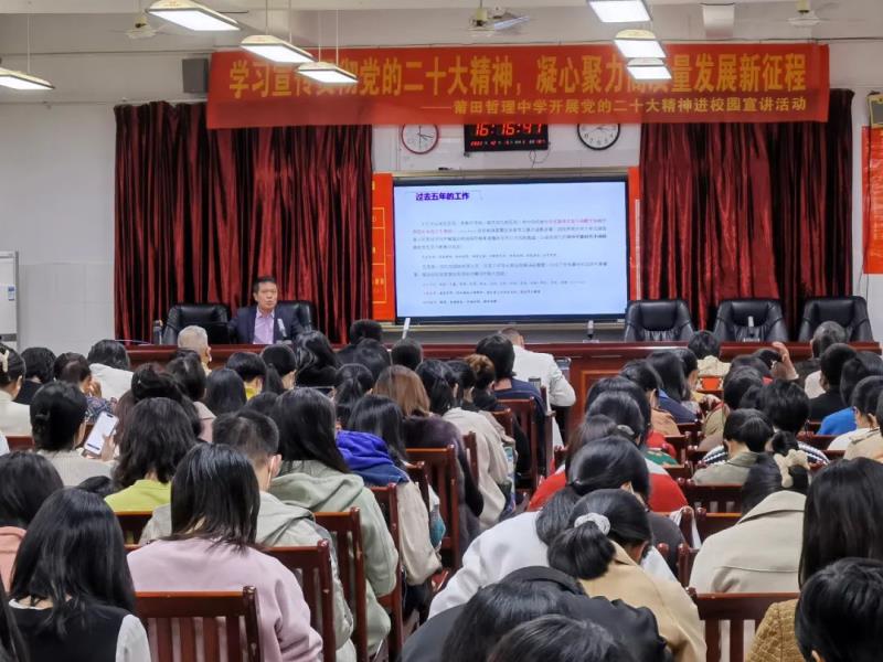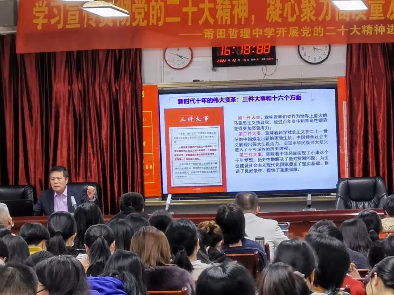 為深入學(xué)習(xí)宣傳貫徹黨的二十大精神,12月5日下午,我校邀請到莆田市理論宣講專家?guī)焓着鷮<?、莆田學(xué)院馬克思主義學(xué)院副院長陳培涵副教授蒞校為全體教職工作了題為《全面建設(shè)社會主義現(xiàn)代化國家的行動綱領(lǐng)——學(xué)習(xí)黨的二十大精神》的宣講。方祖禧書記、陳培基校長等校領(lǐng)導(dǎo)參加了宣講活動。