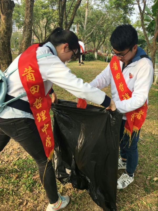 2016年3月7日下午,莆田哲理中學中學團委會組織學生會干部集體參加“保衛(wèi)母親河環(huán)?;顒印薄R溪公園清理垃圾,同時也呼吁大家繼續(xù)樹立“保護環(huán)境,人人有責”的意識,共同創(chuàng)建美麗家園。 此次前往綬溪公園,同學們感受到城市衛(wèi)生面貌發(fā)生了很大的改善,雖然在路上偶爾會發(fā)現(xiàn)一些紙屑和瓶子,但百姓們的生活習慣有了很大的改觀,大家都對這次環(huán)保行感到高興。 “勿以善小而不為,勿以惡小而為之”是所人的行為規(guī)則,對亂扔垃圾者進行譴責,有利于城市公共衛(wèi)生,有利于市民的健康安全,也有助于人們公德心的建立,讓我們都來做文明市民,為創(chuàng)建文明城市貢獻自己的一份力量。
