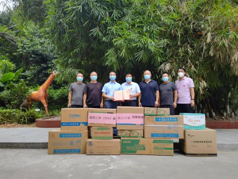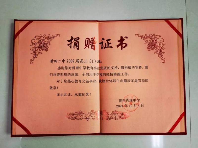 疫情無情人有情。這個(gè)9月,莆田疫情復(fù)起牽動(dòng)著每個(gè)人的心。10月4日,莆田二中2002屆高三(1)班校友募集了一批防疫物資捐贈(zèng)給我校,用于復(fù)學(xué)后的疫情防控工作。黃建清和戴翔兩位校友代表班級(jí)進(jìn)行物資交接,我校在竹園舉行了簡(jiǎn)單的捐贈(zèng)儀式,方祖禧書記代表學(xué)校接受了捐贈(zèng),表達(dá)了對(duì)熱心校友的衷心謝意并為他們頒發(fā)了捐贈(zèng)證書。